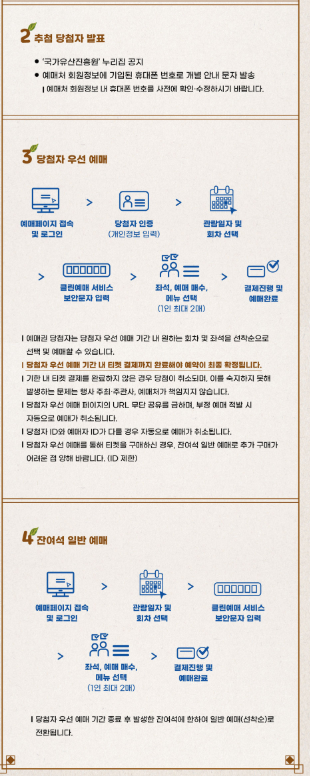 혼잡한 일반 예매보다는 우선 예매 추첨제를 활용하거나, 전화 예매 대상자라면 미리 준비하시는 것이 좋습니다.