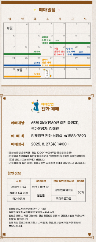 - 예매 대상: 65세 이상, 국가유공자, 장애인