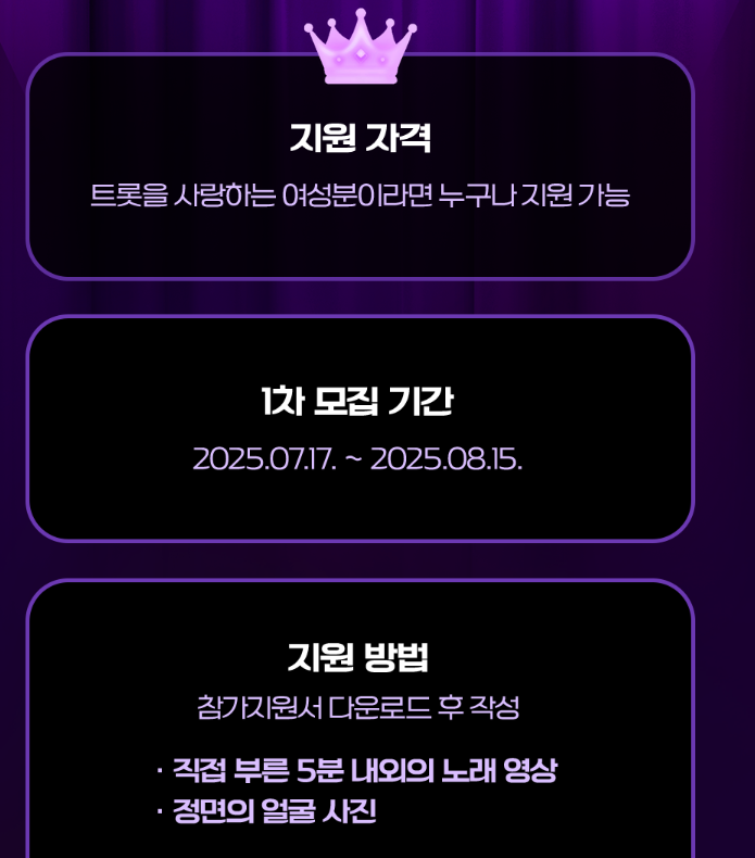 - 자격요건: 트로트를 사랑하는 누구나 가능