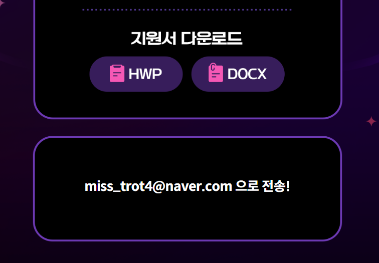 → miss_trot4@naver.com 이메일로 신청서 + 영상 + 사진을 첨부해서 전송합니다.