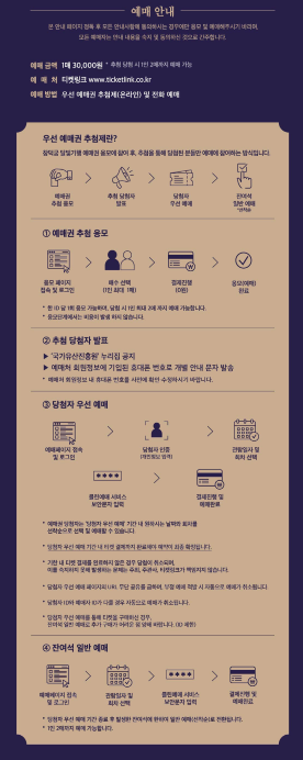 이 행사는 매년 높은 경쟁률을 자랑하는 만큼, 추첨 응모 → 당첨자 결제 → 일반 예매 절차를 꼭 숙지하셔야 합니다.