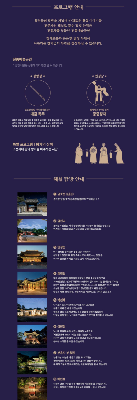 - 부용지·낙선재·연경당 등에서 전통 공연과 다과 제공