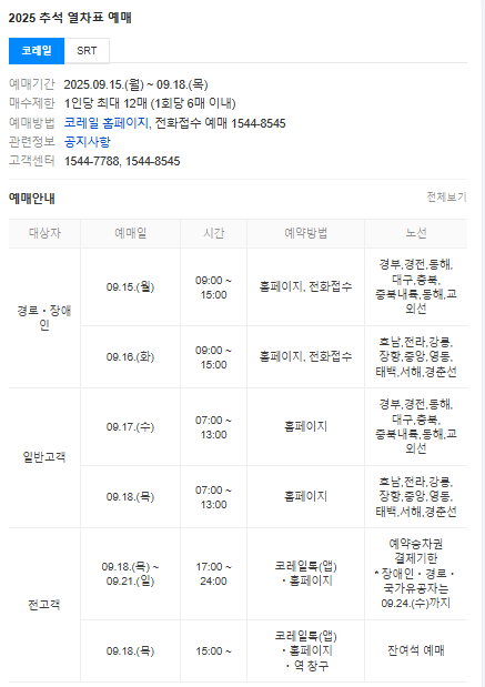 | 경로·장애인 예매 | 2025년 9월 15일(월) | 09:00~15:00 | 홈페이지·전화접수 | 경부, 경전, 동해, 대구, 충북선 등 |